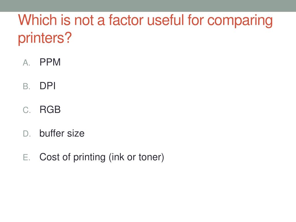 Which is not a factor useful for comparing printers? • PPM • DPI • RGB • buffer size • Cost of printing (ink or toner)