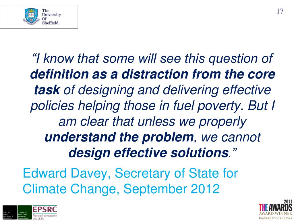 “I know that some will see this question of definition as a distraction from the core task of designing and delivering effective policies helping those in fuel poverty. But I am clear that unless we properly understand the problem, we cannot design effective solutions.” Edward Davey, Secretary of State for Climate Change, September 2012