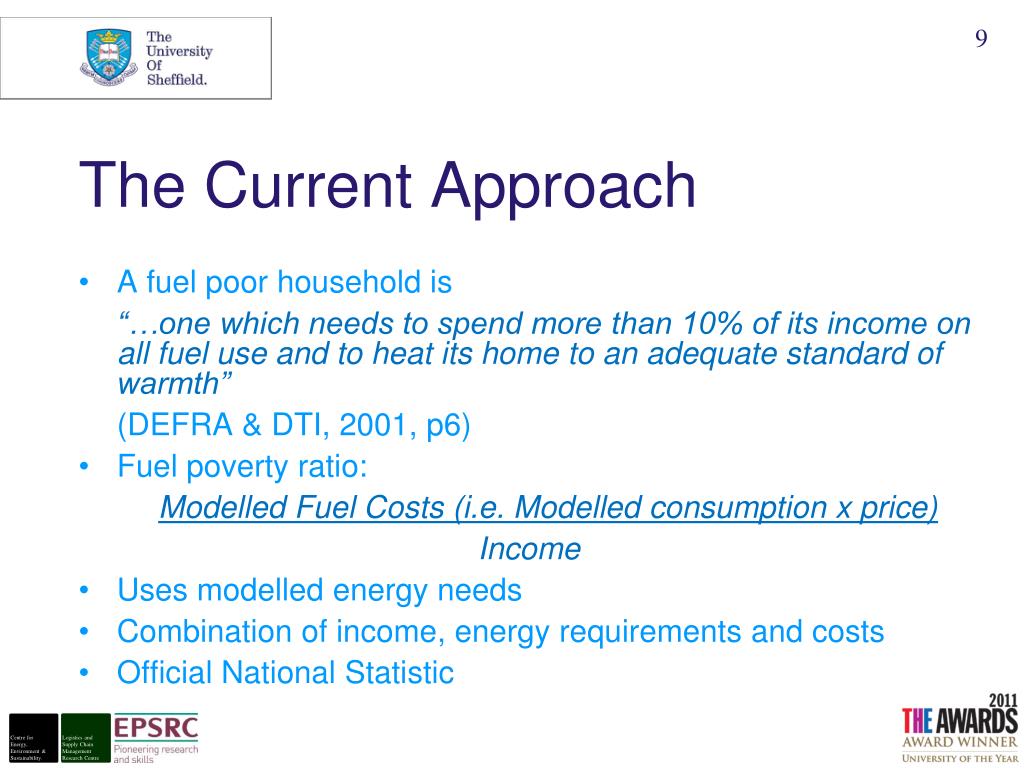 The Current Approach • A fuel poor household is “…one which needs to spend more than 10% of its income on all fuel use and to heat its home to an adequate standard of warmth” (DEFRA & DTI, 2001, p6) • Fuel poverty ratio: Modelled Fuel Costs (i.e. Modelled consumption x price) Income • Uses modelled energy needs • Combination of income, energy requirements and costs • Official National Statistic