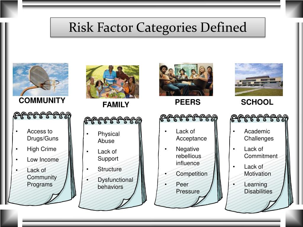 Risk Factor Categories Defined COMMUNITY PEERS SCHOOL FAMILY • Access to Drugs/Guns • High Crime • Low Income • Lack of Community Programs • Lack of Acceptance • Negative rebellious influence • Competition • Peer Pressure • Academic Challenges • Lack of Commitment • Lack of Motivation • Learning Disabilities • Physical Abuse • Lack of Support • Structure • Dysfunctional behaviors