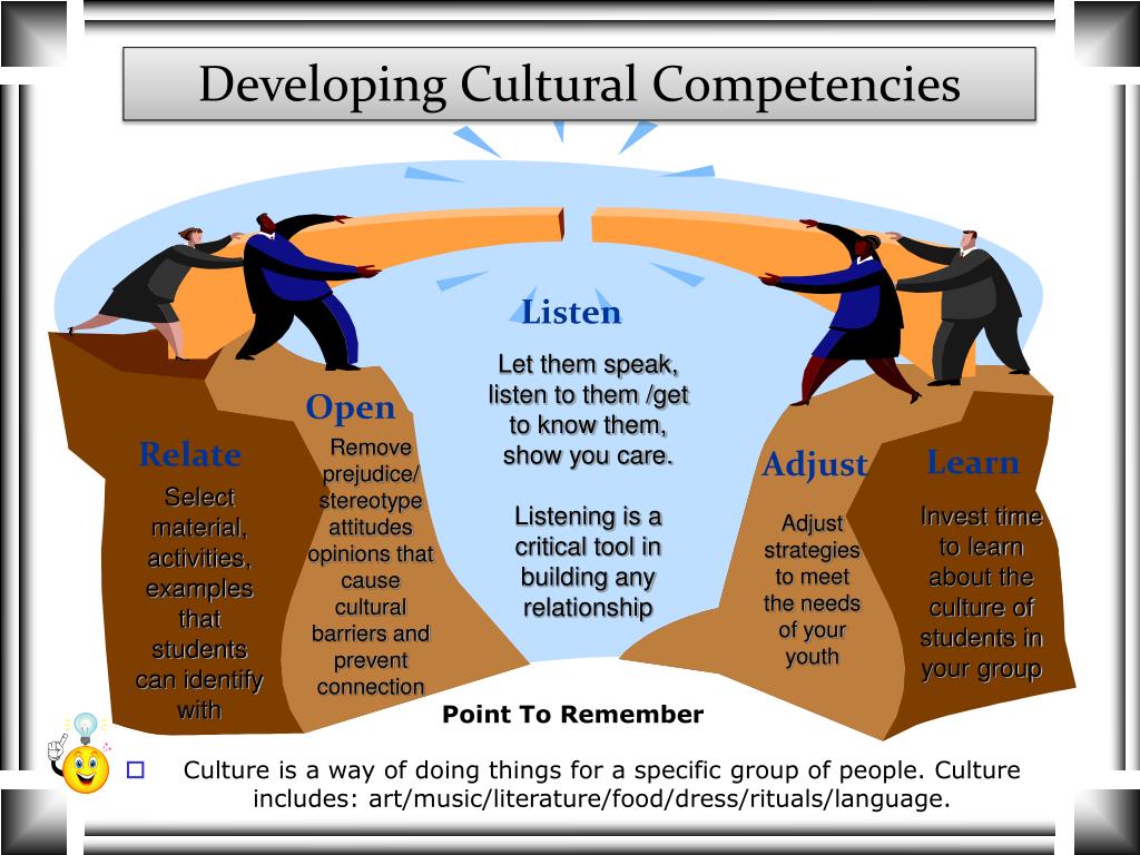 Developing Cultural Competencies Listen Let them speak, listen to them /get to know them, show you care. Listening is a critical tool in building any relationship Open Learn Relate Remove prejudice/ stereotype attitudes opinions that cause cultural barriers and prevent connection Adjust Select material, activities, examples that students can identify with Invest time to learn about the culture of students in your group Adjust strategies to meet the needs of your youth Point To Remember • Culture is a way of doing things for a specific group of people. Culture includes: art/music/literature/food/dress/rituals/language.