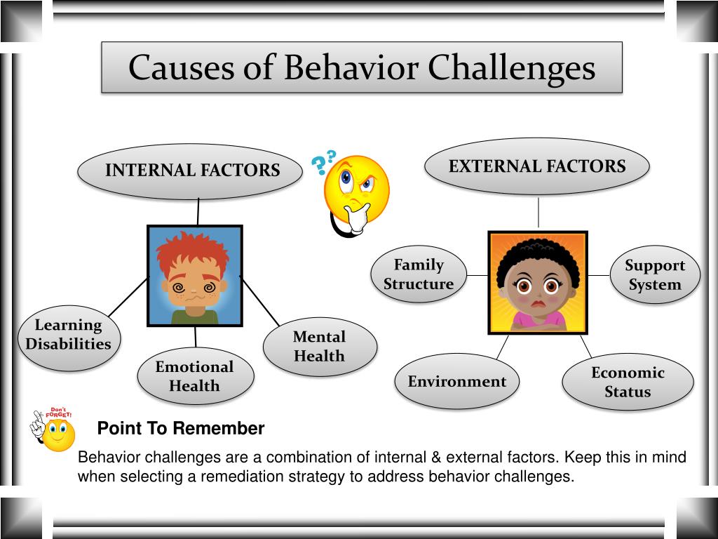 Causes of Behavior Challenges EXTERNAL FACTORS INTERNAL FACTORS Family Structure Support System Learning Disabilities Mental Health Emotional Health Environment Economic Status Point To Remember Behavior challenges are a combination of internal & external factors. Keep this in mind when selecting a remediation strategy to address behavior challenges.