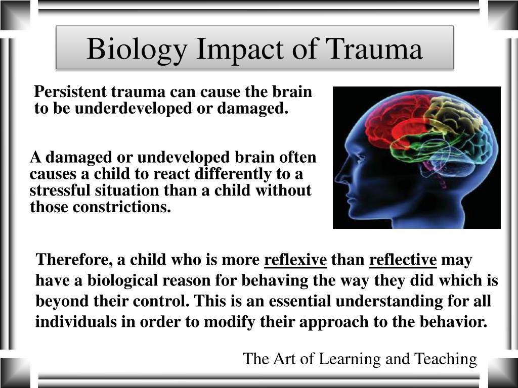 Biology Impact of Trauma Persistent trauma can cause the brain to be underdeveloped or damaged. A damaged or undeveloped brain often causes a child to react differently to a stressful situation than a child without those constrictions. Therefore, a child who is more reflexive than reflective may have a biological reason for behaving the way they did which is beyond their control. This is an essential understanding for all individuals in order to modify their approach to the behavior. The Art of Learning and Teaching