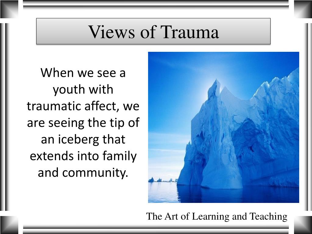 Views of Trauma When we see a youth with traumatic affect, we are seeing the tip of an iceberg that extends into family and community. The Art of Learning and Teaching