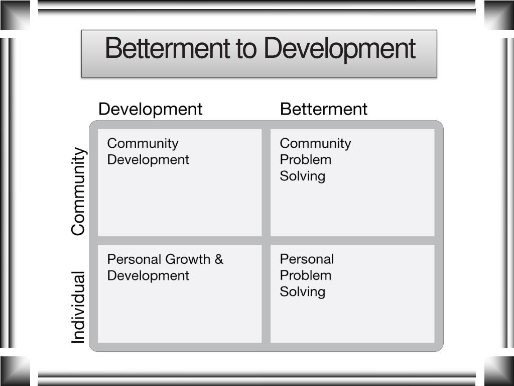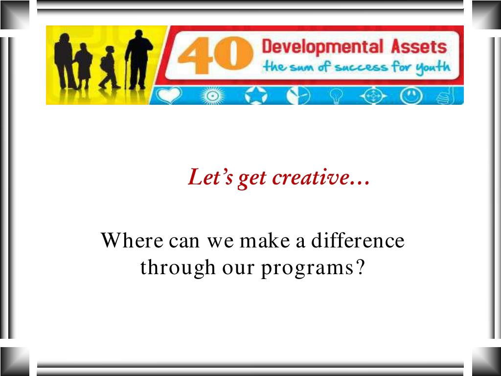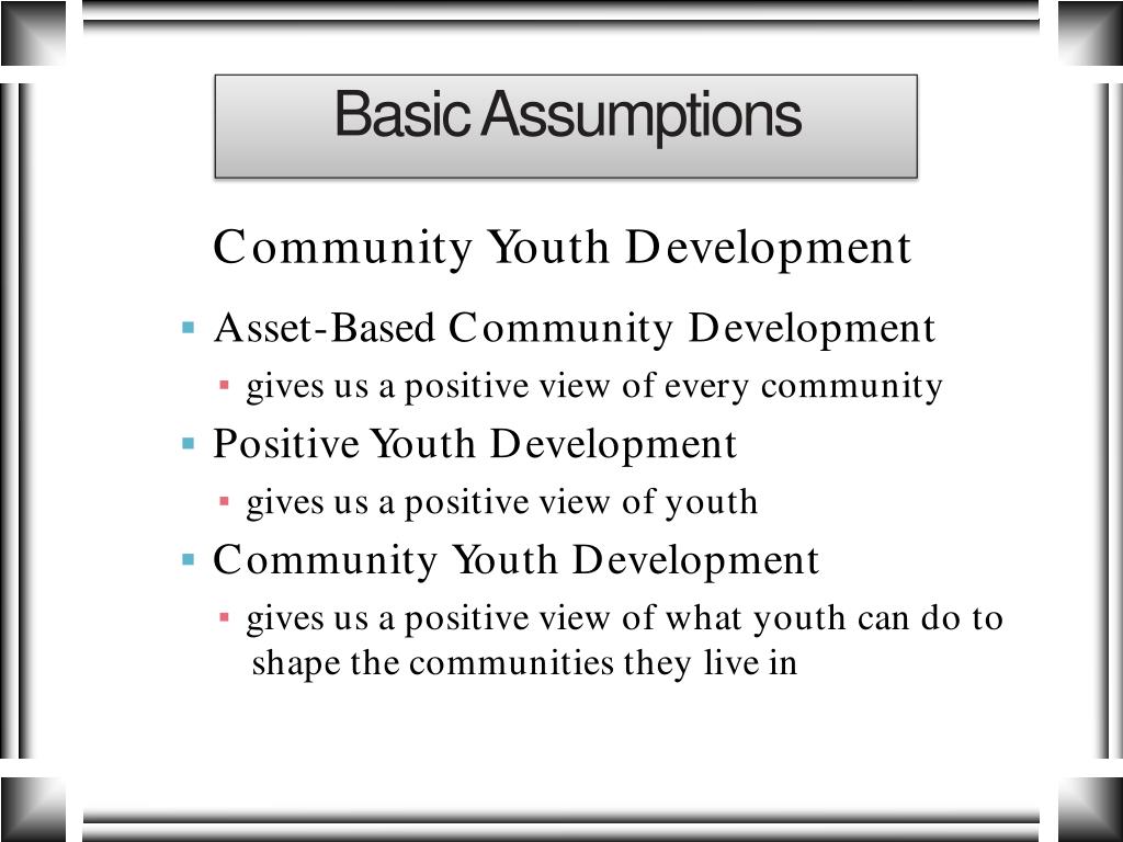 Basic Assumptions CommunityYouthDevelopment • Asset-BasedCommunityDevelopment • givesus a positiveviewof everycommunity • PositiveYouthDevelopment • givesus a positiveviewof youth • CommunityYouthDevelopment • givesus a positiveviewof whatyouthcan doto • shapethecommunitiestheylivein