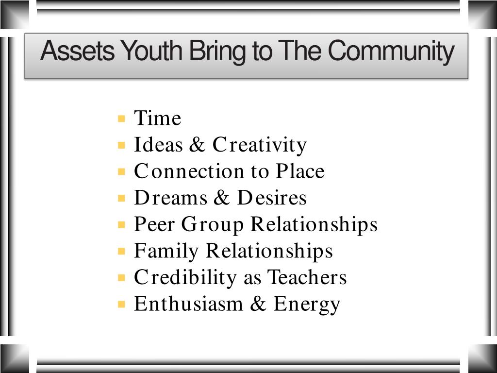 Assets Youth Bring to The Community • Time • Ideas&Creativity • ConnectiontoPlace • Dreams&Desires • PeerGroupRelationships • FamilyRelationships • CredibilityasTeachers • Enthusiasm&Energy