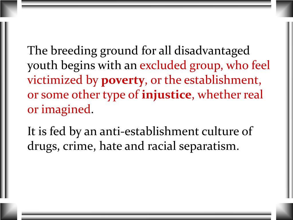 The breeding ground for all disadvantaged youth begins with an excluded group, who feel victimized by poverty, or the establishment, or some other type of injustice, whether real or imagined. It is fed by an anti-establishment culture of drugs, crime, hate and racial separatism.
