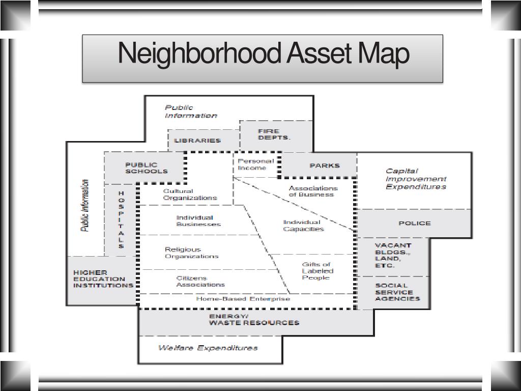Asset Mapping • DiscoveringCommunityCapacity • Individuals • peoplewithgiftsandcapacities • Associations • peopleworking togetherforgood • Institutions • richstorehousesofaccessibleresources • Outsidehelp • investmentincapacity-building,notservice • expansion