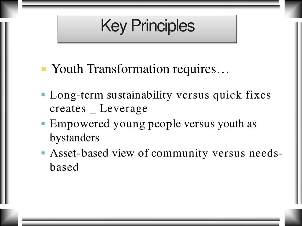 Key Principles • Youth Transformation requires… • Long-termsustainability versus quick fixes creates _ Leverage • Empoweredyoungpeople versus youth as bystanders • Asset-basedviewofcommunity versus needs-based
