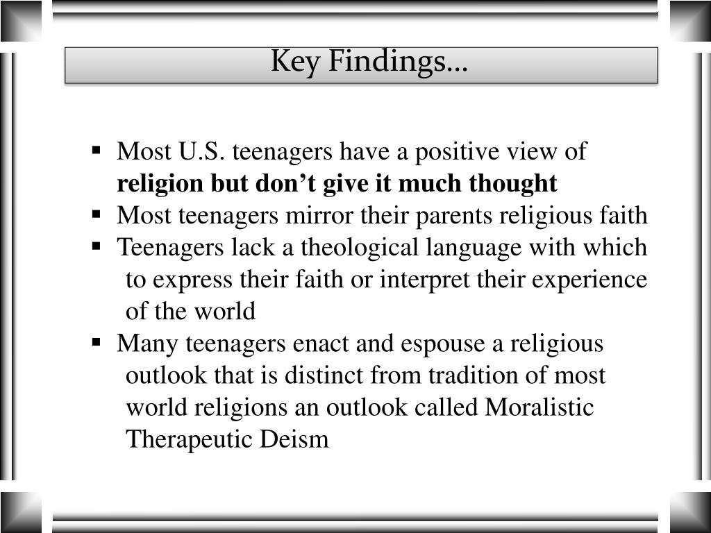 Key Findings… • Most U.S. teenagers have a positive view of religion but don’t give it much thought • Most teenagers mirror their parents religious faith • Teenagers lack a theological language with which • to express their faith or interpret their experience • of the world • Many teenagers enact and espouse a religious • outlook that is distinct from tradition of most • world religions an outlook called Moralistic • Therapeutic Deism