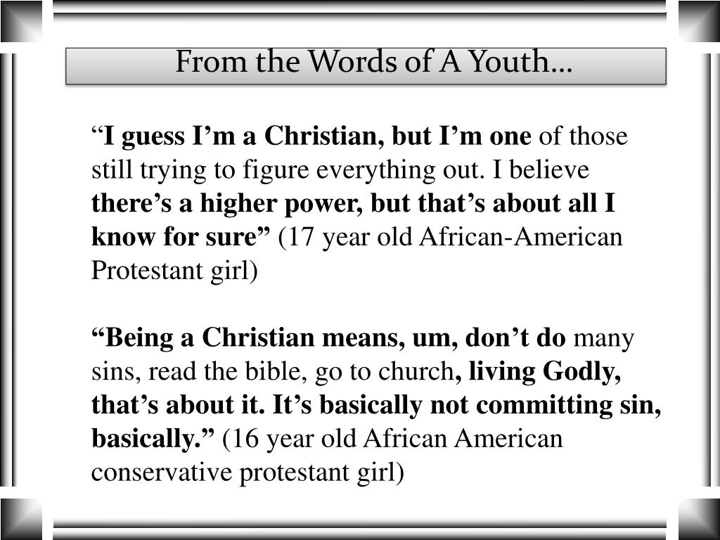 From the Words of A Youth… “I guess I’m a Christian, but I’m one of those still trying to figure everything out. I believe there’s a higher power, but that’s about all I know for sure”(17 year old African-American Protestant girl) “Being a Christian means, um, don’t do many sins, read the bible, go to church, living Godly, that’s about it. It’s basically not committing sin, basically.”(16 year old African American conservative protestant girl)