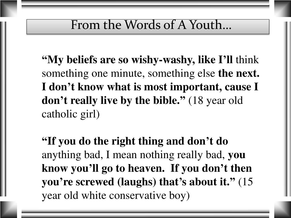 From the Words of A Youth… “My beliefs are so wishy-washy, like I’ll think something one minute, something else the next. I don’t know what is most important, cause I don’t really live by the bible.” (18 year old catholic girl) “If you do the right thing and don’t do anything bad, I mean nothing really bad, you know you’ll go to heaven. If you don’t then you’re screwed (laughs) that’s about it.” (15 year old white conservative boy)