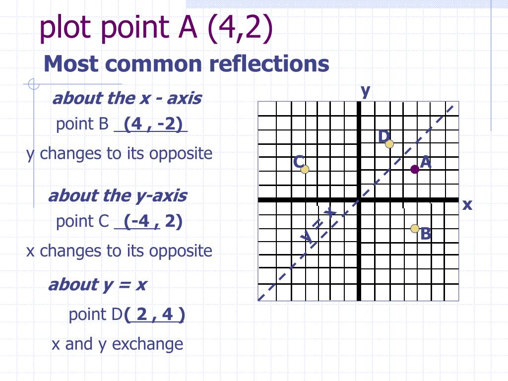 plot point A (4,2) Most common reflections y about the x - axis point B ________ (4 , -2) D y changes to its opposite C A about the y-axis x point C _____ (-4 , 2) y = x B x changes to its opposite about y = x point D ______ ( 2 , 4 ) x and y exchange