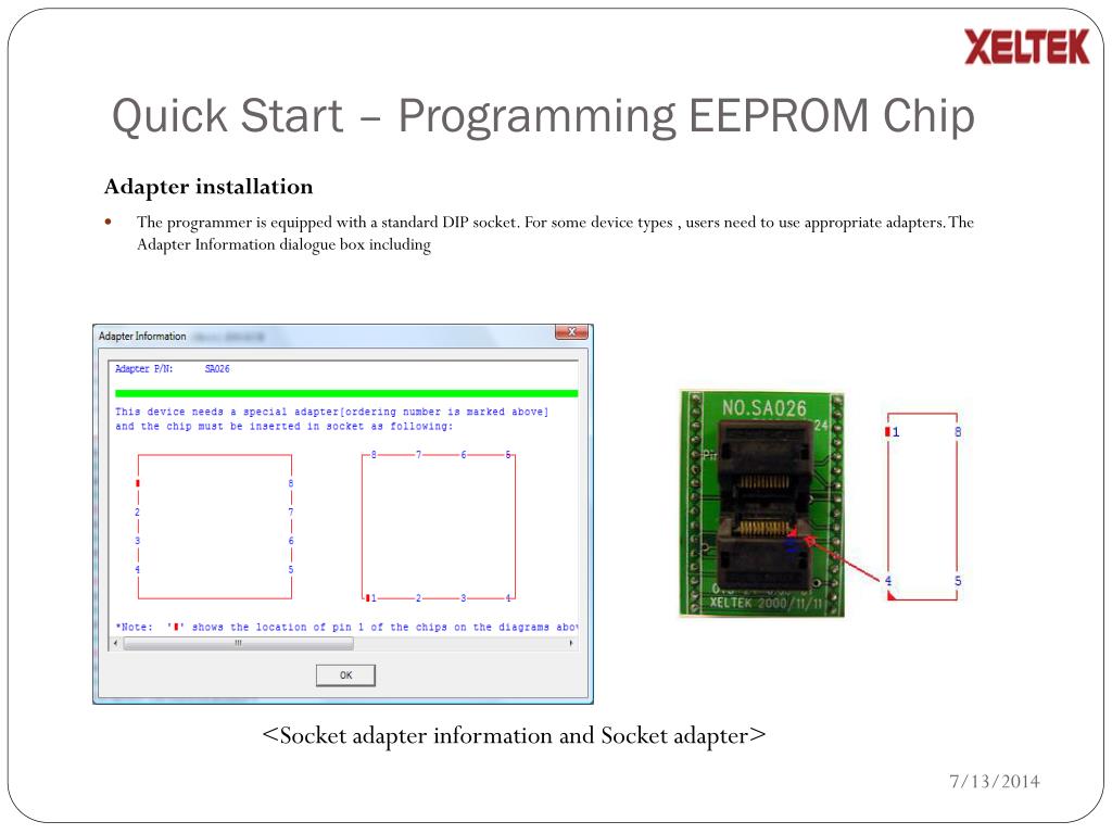 Quick Start – Programming EEPROM Chip Adapter installation • The programmer is equipped with a standard DIP socket. For some device types , users need to use appropriate adapters. The Adapter Information dialogue box including <Socket adapter information and Socket adapter>