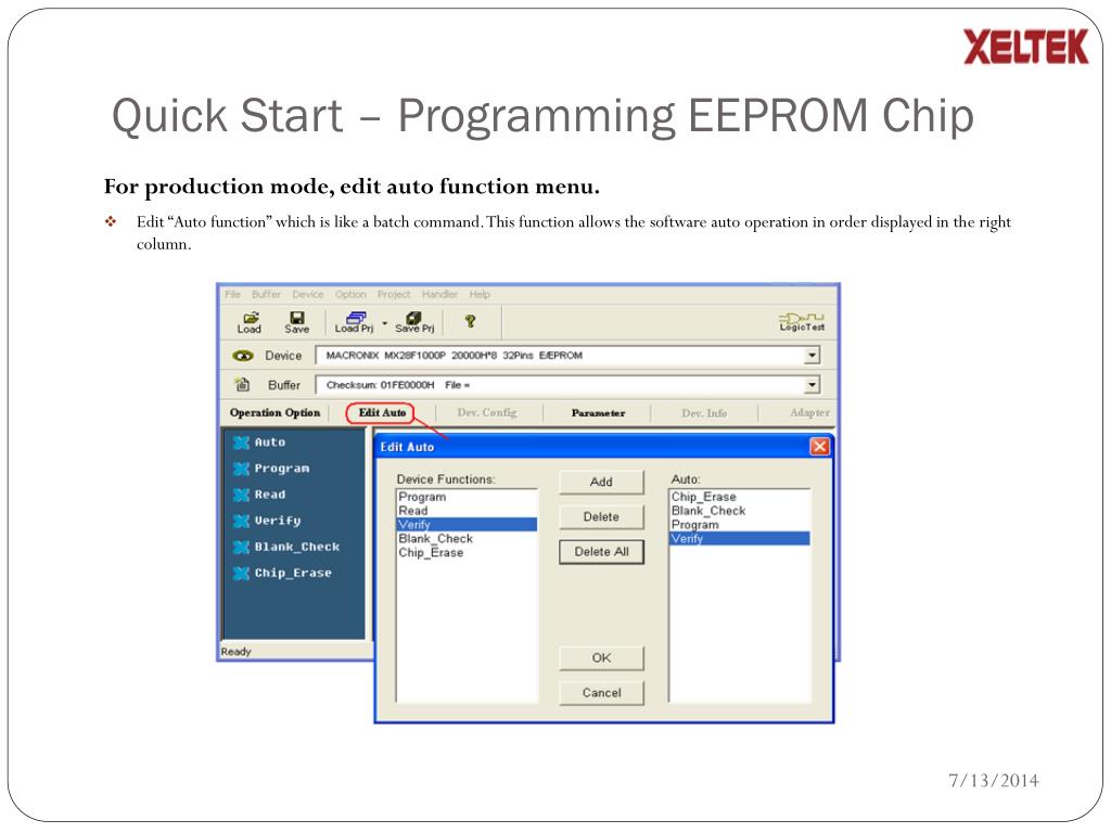 Quick Start – Programming EEPROM Chip For production mode, edit auto function menu. • Edit “Auto function” which is like a batch command. This function allows the software auto operation in order displayed in the right column.