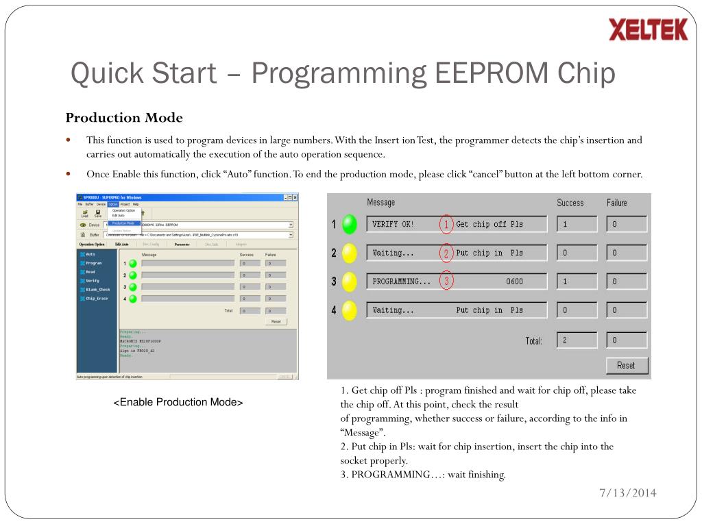 Quick Start – Programming EEPROM Chip Production Mode • This function is used to program devices in large numbers. With the Insert ion Test, the programmer detects the chip’s insertion and carries out automatically the execution of the auto operation sequence. • Once Enable this function, click “Auto” function. To end the production mode, please click “cancel” button at the left bottom corner. 1. Get chip off Pls : program finished and wait for chip off, please take the chip off. At this point, check the result of programming, whether success or failure, according to the info in “Message”. 2. Put chip in Pls: wait for chip insertion, insert the chip into the socket properly. 3. PROGRAMMING…: wait finishing. <Enable Production Mode>