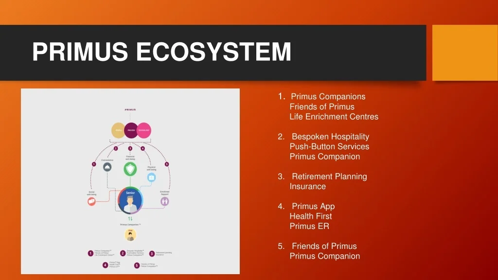 PRIMUS ECOSYSTEM 1. Primus Companions Friends of Primus Life Enrichment Centres 2. Bespoken Hospitality Push-Button Services Primus Companion 3. Retirement Planning Insurance 4. Primus App Health First Primus ER 5. Friends of Primus Primus Companion