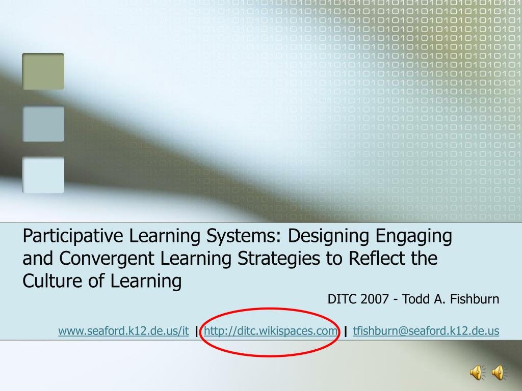 Participative Learning Systems: Designing Engaging and Convergent Learning Strategies to Reflect the Culture of Learning DITC 2007 - Todd A. Fishburn www.seaford.k12.de.us/it|http://ditc.wikispaces.com|tfishburn@seaford.k12.de.us