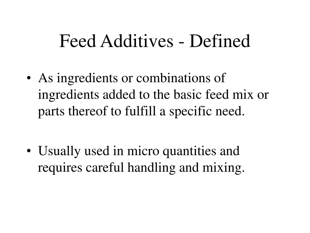 Feed Additives - Defined • As ingredients or combinations of ingredients added to the basic feed mix or parts thereof to fulfill a specific need. • Usually used in micro quantities and requires careful handling and mixing.