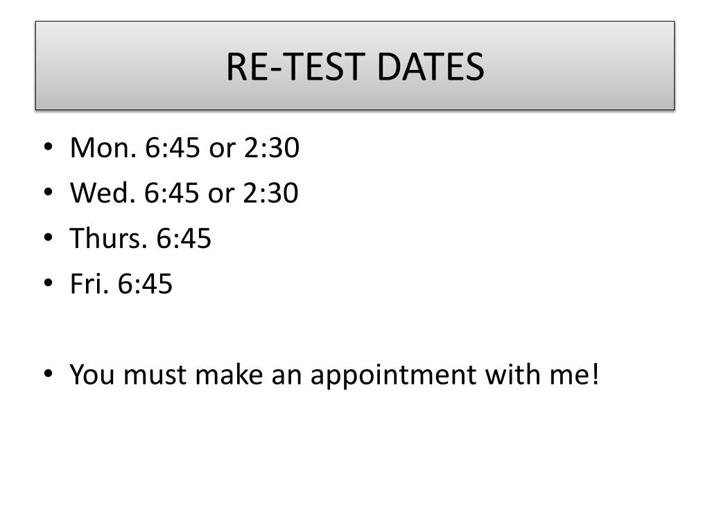 RE-TEST DATES • Mon. 6:45 or 2:30 • Wed. 6:45 or 2:30 • Thurs. 6:45 • Fri. 6:45 • You must make an appointment with me!