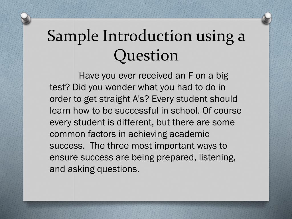 Sample Introduction using a Question Have you ever received an F on a big test? Did you wonder what you had to do in order to get straight A's? Every student should learn how to be successful in school. Of course every student is different, but there are some common factors in achieving academic success. The three most important ways to ensure success are being prepared, listening, and asking questions.