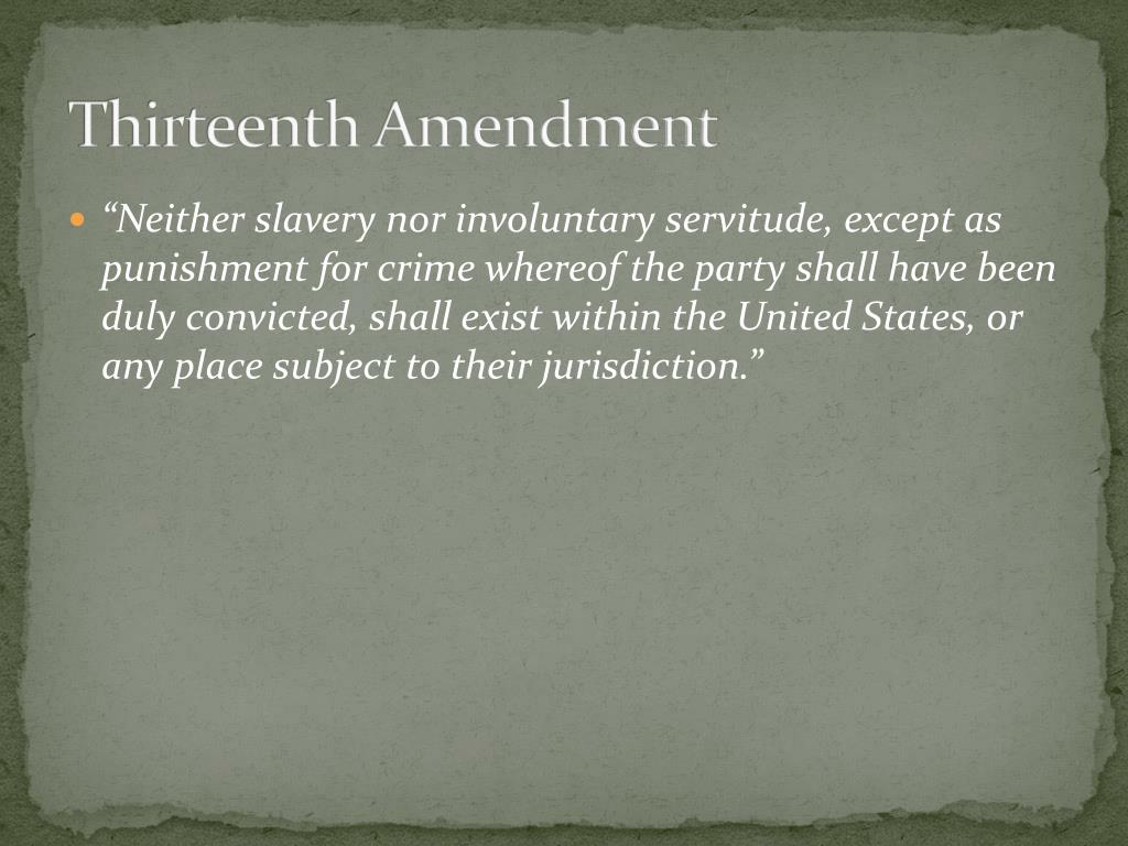 Thirteenth Amendment • “Neither slavery nor involuntary servitude, except as punishment for crime whereof the party shall have been duly convicted, shall exist within the United States, or any place subject to their jurisdiction.”