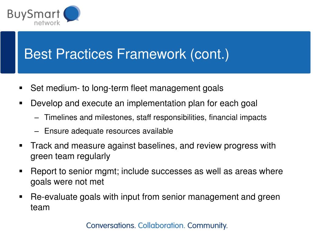 Best Practices Framework (cont.) • Set medium- to long-term fleet management goals • Develop and execute an implementation plan for each goal • Timelines and milestones, staff responsibilities, financial impacts • Ensure adequate resources available • Track and measure against baselines, and review progress with green team regularly • Report to senior mgmt; include successes as well as areas where goals were not met • Re-evaluate goals with input from senior management and green team