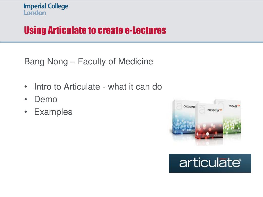 Using Articulate to create e-Lectures Bang Nong – Faculty of Medicine • Intro to Articulate - what it can do • Demo • Examples