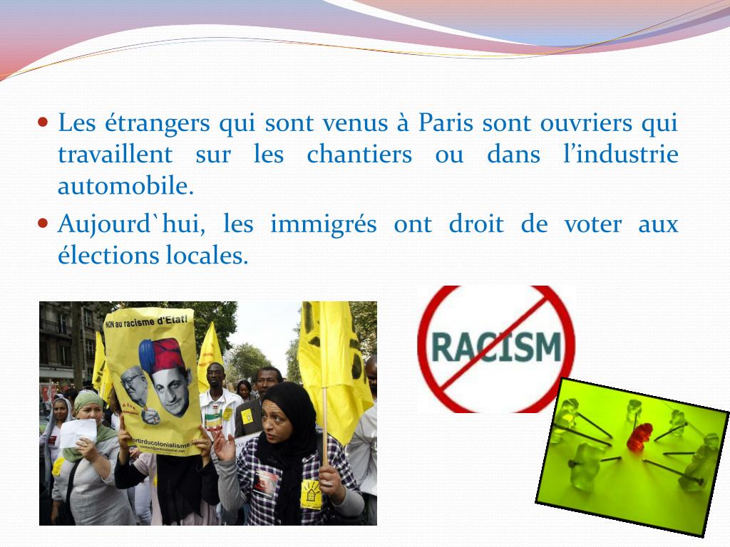 Les étrangers qui sont venus à Paris sont ouvriers qui travaillent sur les chantiersou dans l’industrieautomobile. • Aujourd`hui, les immigrés ont droit de voter aux élections locales.