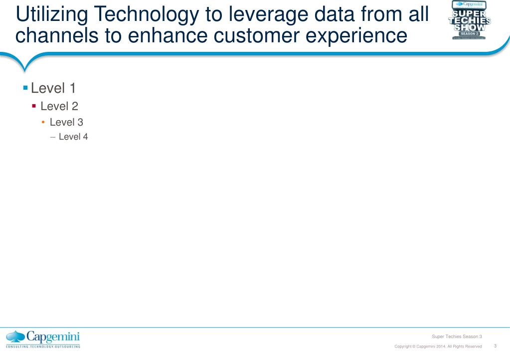 Super Techies Season 3. Team Name. Digital Strategy. Level 1 Level 2 Level 3 Level 4. Utilizing Technology to leverage data from all channels to enhance customer experience. Level 1 Level 2 Level 3 Level 4. Brief outline of the technology architecture. Level 1 Level 2 Level 3