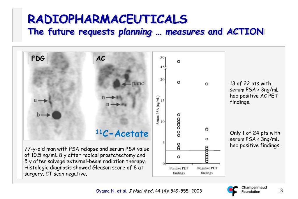 FDG AC RADIOPHARMACEUTICALS The future requests planning … measures and ACTION 13 of 22 pts with serum PSA > 3ng/mL had positive AC PET findings. Only 1 of 24 pts with serum PSA ≤ 3ng/mL had positive findings. 11C-Acetate 77-y-old man with PSA relapse and serum PSA value of 10.5 ng/mL 8 y after radical prostatectomy and 5 y after salvage external-beam radiation therapy. Histologic diagnosis showed Gleason score of 8 at surgery. CT scan negative. Oyama N, et al. J Nucl Med, 44 (4): 549-555; 2003