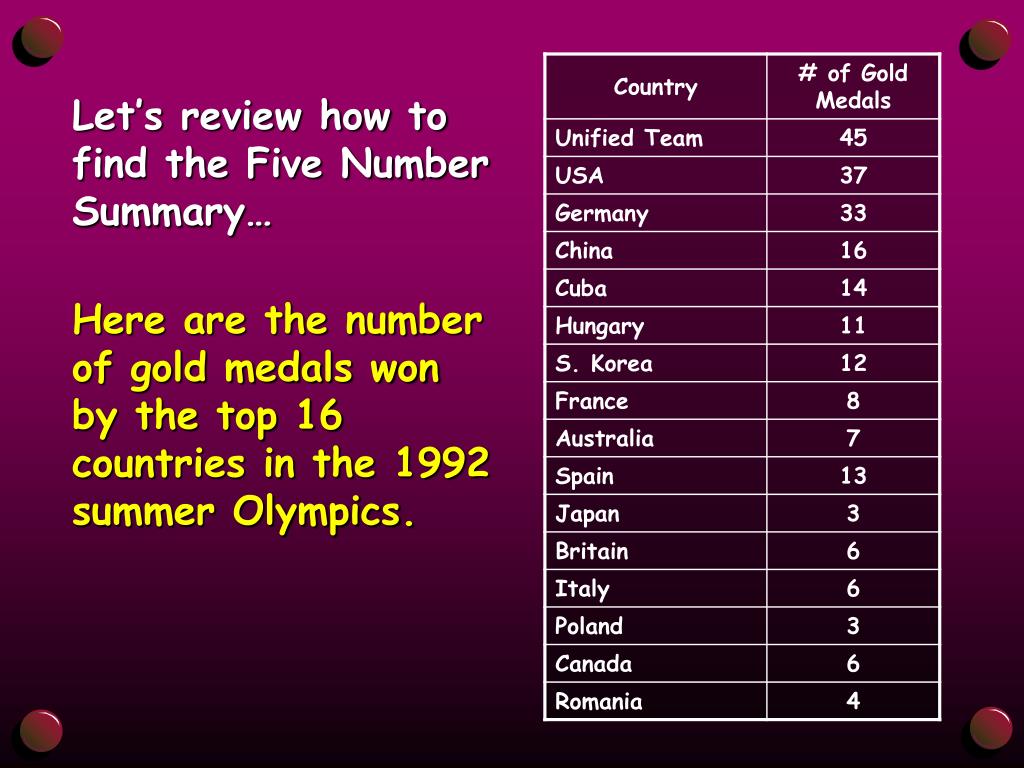 Let’s review how to find the Five Number Summary… Here are the number of gold medals won by the top 16 countries in the 1992 summer Olympics.