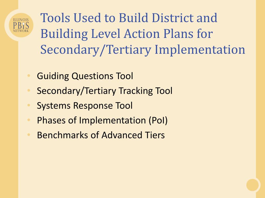 Tools Used to Build District and Building Level Action Plans for Secondary/Tertiary Implementation • Guiding Questions Tool • Secondary/Tertiary Tracking Tool • Systems Response Tool • Phases of Implementation (PoI) • Benchmarks of Advanced Tiers