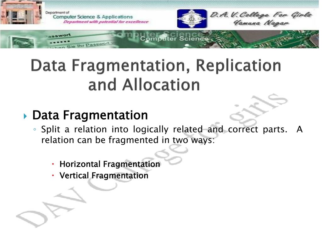 Data Fragmentation, Replication and Allocation • Data Fragmentation • Split a relation into logically related and correct parts. A relation can be fragmented in two ways: • Horizontal Fragmentation • Vertical Fragmentation