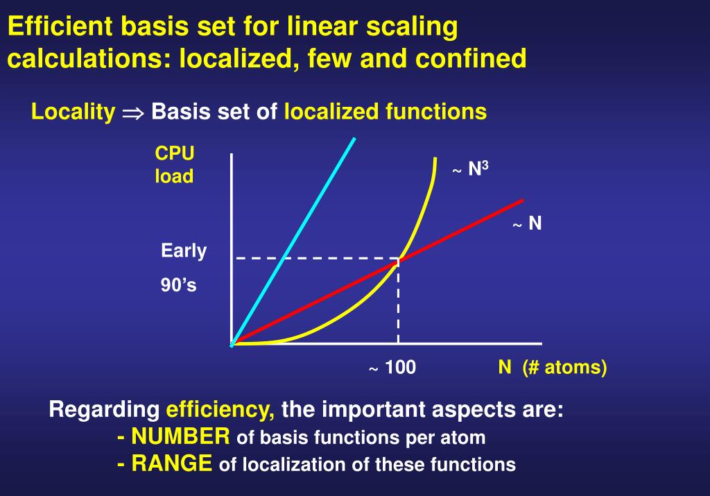 Efficient basis set for linear scaling calculations: localized, few and confined CPU load ~ N3 ~ N Early 90’s ~ 100 N (# atoms) Locality Basis set of localized functions • Regardingefficiency, the important aspects are: • - NUMBER of basis functions per atom • - RANGEof localization of these functions
