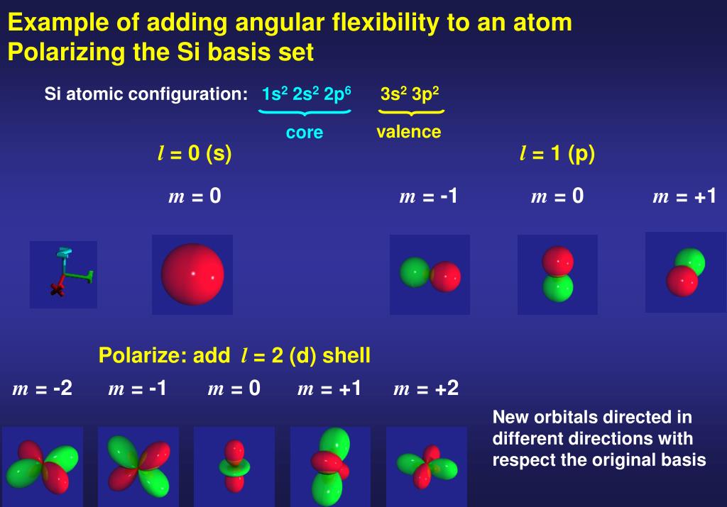 Example of adding angular flexibility to an atomPolarizing the Si basis set l = 0 (s) l = 1 (p) Si atomic configuration:1s2 2s2 2p63s2 3p2 m = 0 m = -1 m = 0 m = +1 valence core m = -2 m = -1 m = 0 m = +1 m = +2 Polarize: add l = 2 (d) shell New orbitals directed in different directions with respect the original basis