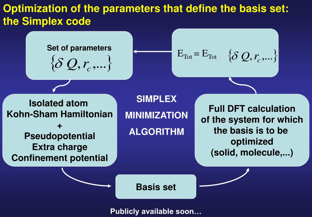 Optimization of the parameters that define the basis set: the Simplex code ETot = ETot Set of parameters SIMPLEX MINIMIZATION ALGORITHM Isolated atom Kohn-Sham Hamiltonian + Pseudopotential Extra charge Confinement potential Full DFT calculation of the system for which the basis is to be optimized (solid, molecule,...) Basis set Publicly available soon…