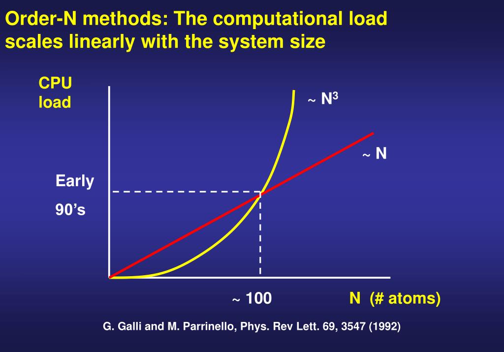 Order-N methods: The computational load scales linearly with the system size CPU load ~ N3 ~ N Early 90’s ~ 100 N (# atoms) G. Galli and M. Parrinello, Phys. Rev Lett. 69, 3547 (1992)
