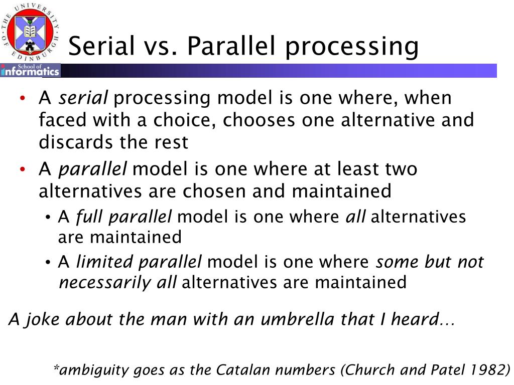 Serial vs. Parallel processing • A serial processing model is one where, when faced with a choice, chooses one alternative and discards the rest • A parallel model is one where at least two alternatives are chosen and maintained • A full parallel model is one where all alternatives are maintained • A limited parallel model is one where some but not necessarily all alternatives are maintained A joke about the man with an umbrella that I heard… *ambiguity goes as the Catalan numbers (Church and Patel 1982)