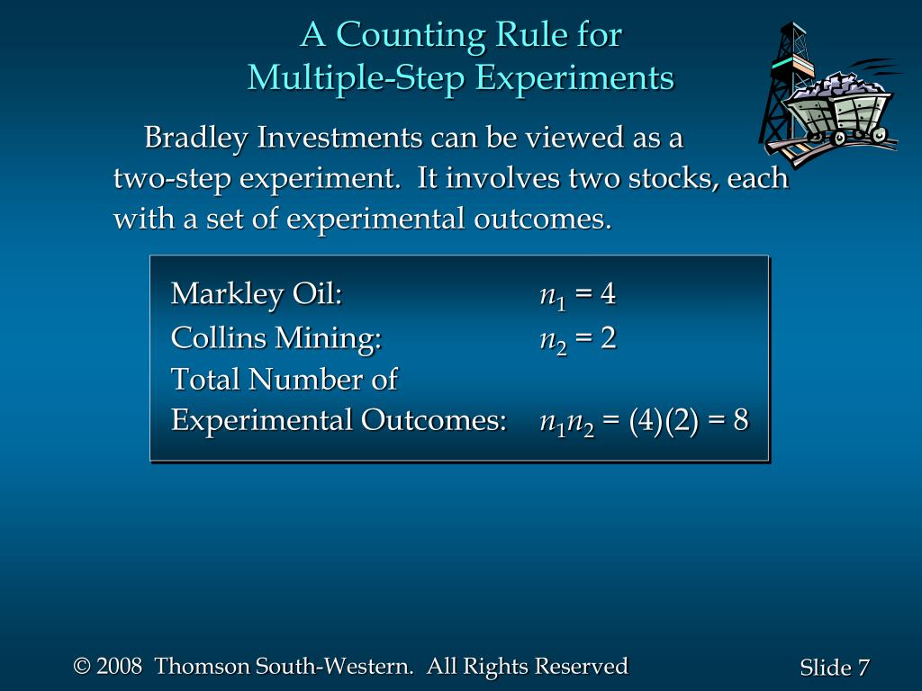A Counting Rule for Multiple-Step Experiments Bradley Investments can be viewed as a two-step experiment. It involves two stocks, each with a set of experimental outcomes. Markley Oil: n1 = 4 Collins Mining: n2 = 2 Total Number of Experimental Outcomes: n1n2 = (4)(2) = 8