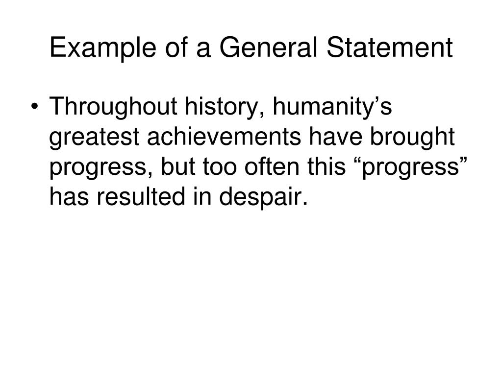 Example of a General Statement • Throughout history, humanity’s greatest achievements have brought progress, but too often this “progress” has resulted in despair.