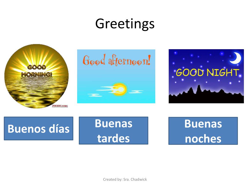 Greetings Buenos días Buenastardes Buenasnoches Created by: Sra. Chadwick
