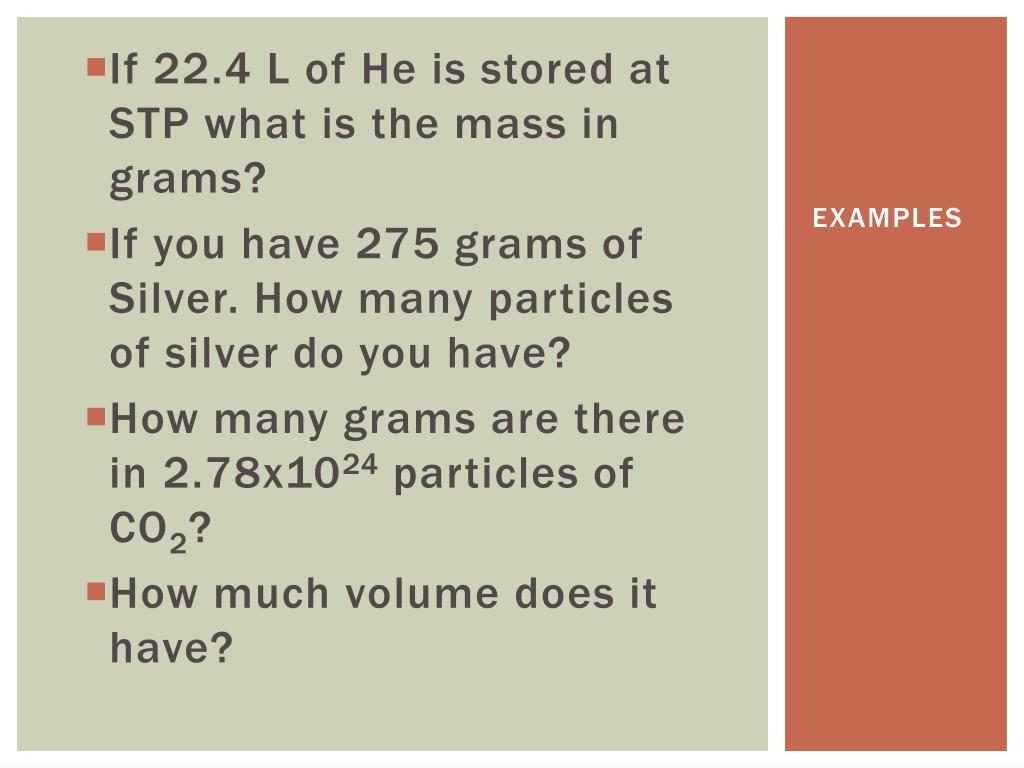 If 22.4 L of He is stored at STP what is the mass in grams? • If you have 275 grams of Silver. How many particles of silver do you have? • How many grams are there in 2.78x1024 particles of CO2? • How much volume does it have? Examples