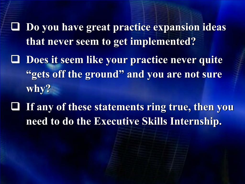 q Do you have great practice expansion ideas that never seem to get implemented? q Does it seem like your practice never quite “gets off the ground” and you are not sure why? q If any of these statements ring true, then you need to do the Executive Skills Internship.