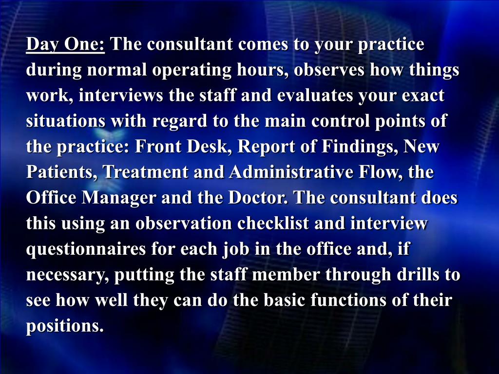 Day One: The consultant comes to your practice during normal operating hours, observes how things work, interviews the staff and evaluates your exact situations with regard to the main control points of the practice: Front Desk, Report of Findings, New Patients, Treatment and Administrative Flow, the Office Manager and the Doctor. The consultant does this using an observation checklist and interview questionnaires for each job in the office and, if necessary, putting the staff member through drills to see how well they can do the basic functions of their positions.