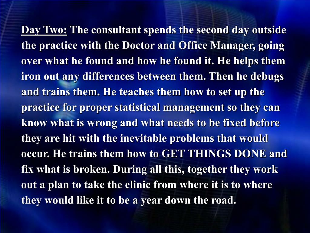 Day Two: The consultant spends the second day outside the practice with the Doctor and Office Manager, going over what he found and how he found it. He helps them iron out any differences between them. Then he debugs and trains them. He teaches them how to set up the practice for proper statistical management so they can know what is wrong and what needs to be fixed before they are hit with the inevitable problems that would occur. He trains them how to GET THINGS DONE and fix what is broken. During all this, together they work out a plan to take the clinic from where it is to where they would like it to be a year down the road.
