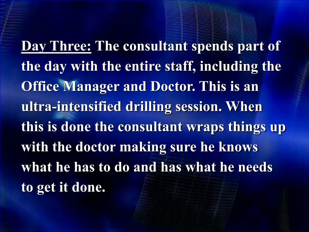Day Three: The consultant spends part of the day with the entire staff, including the Office Manager and Doctor. This is an ultra-intensified drilling session. When this is done the consultant wraps things up with the doctor making sure he knows what he has to do and has what he needs to get it done.