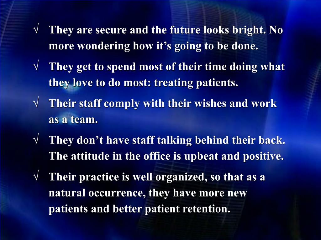 √ They are secure and the future looks bright. No more wondering how it’s going to be done. √ They get to spend most of their time doing what they love to do most: treating patients. √ Their staff comply with their wishes and work as a team. √ They don’t have staff talking behind their back. The attitude in the office is upbeat and positive. √ Their practice is well organized, so that as a natural occurrence, they have more new patients and better patient retention.