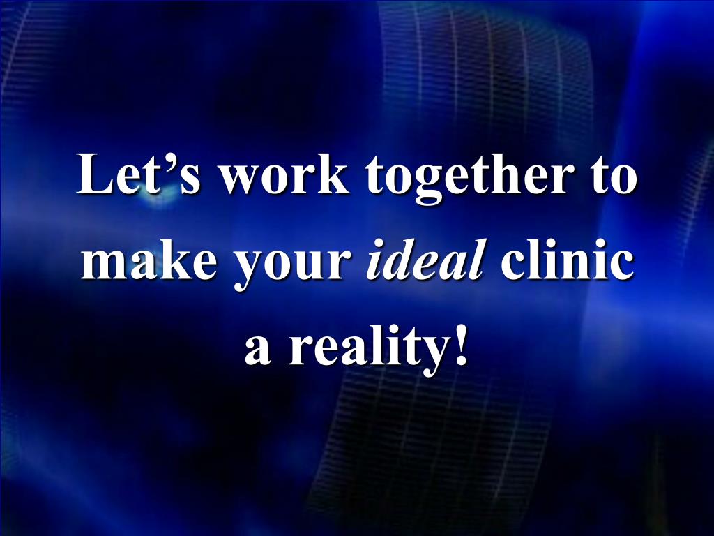 Ensure your practice expansion is stable; no more of the “roller-coaster effect.” • To create a harmonious practice that is both fun to work in and enjoyable for patients to be part of. • Get the four main areas of your practice producing at 100% efficiency.