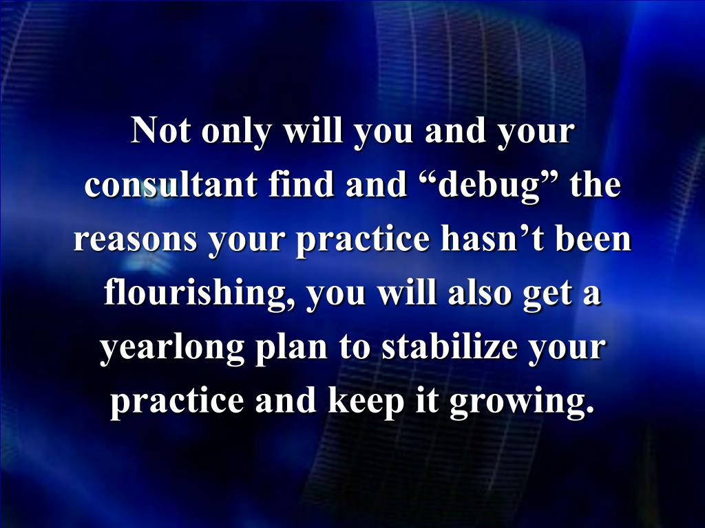Not only will you and your consultant find and “debug” the reasons your practice hasn’t been flourishing, you will also get a yearlong plan to stabilize your practice and keep it growing.
